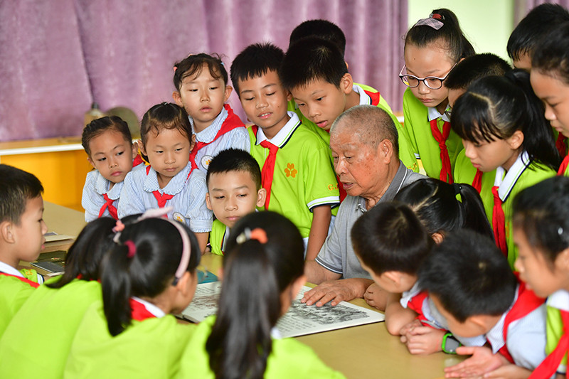 在广西柳州市柳北区桂景湾路小学,老党员给小学生讲述党史故事(6月9日摄)。新华社记者 黄孝邦 摄
