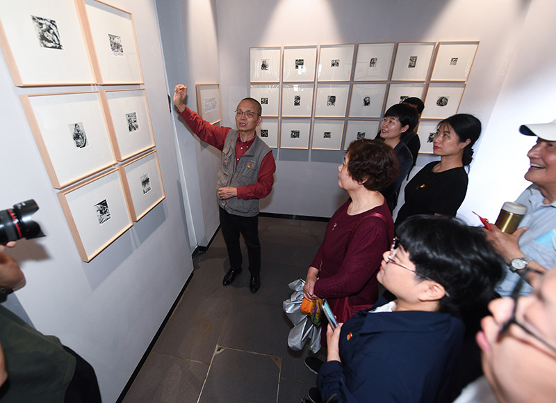 观众在位于浙江省杭州市临安区高虹镇的高虹新四军红色文化体验馆欣赏革命主题版画作品(5月30日摄)。新华社记者 徐昱 摄