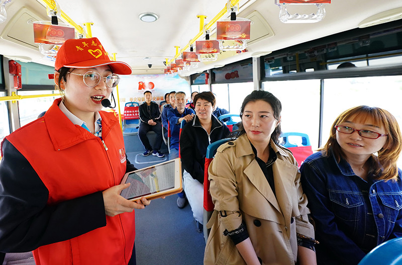 河北省唐山市海港经济开发区志愿者宣讲员在红色主题公交车上给乘客讲革命故事(5月10日摄)。新华社记者 杨世尧 摄